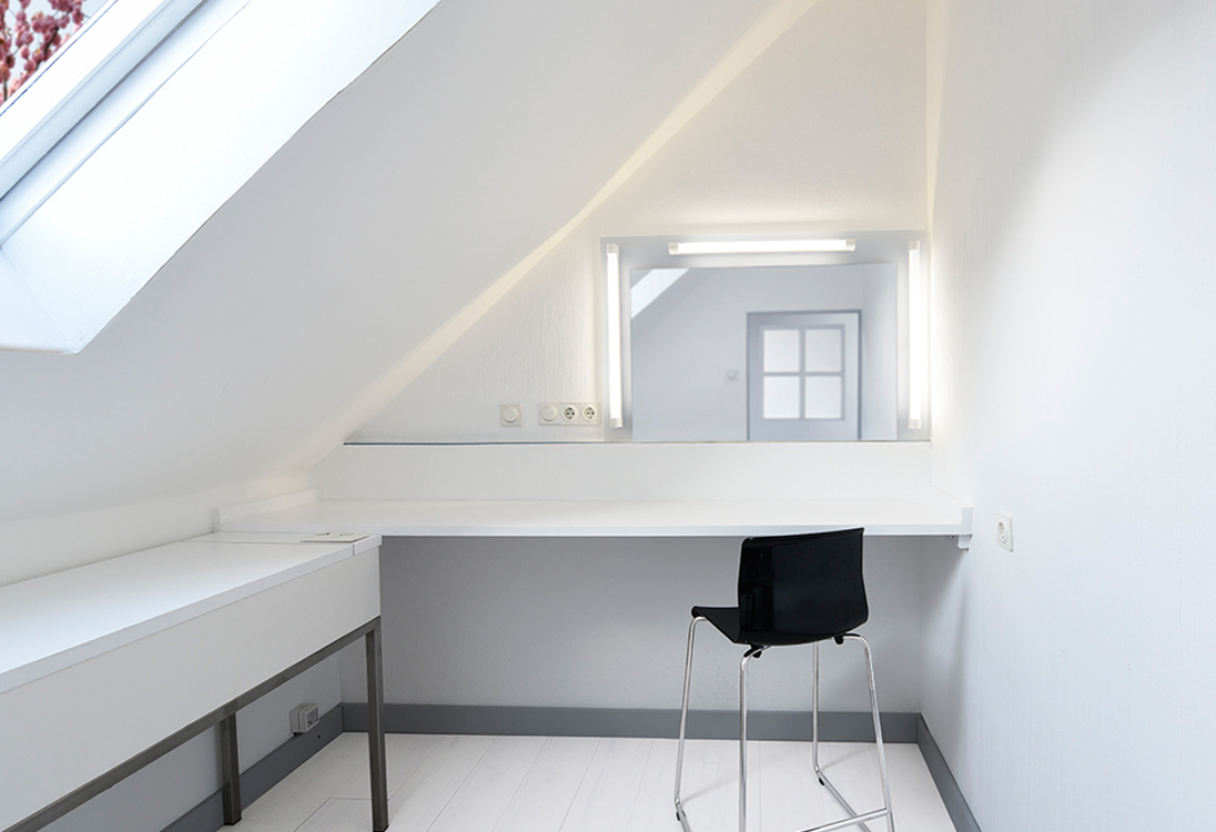Hier erwartet Sie ein Büro mit schnellem W-LAN, eine vollständig eingerichtete Küche mit großem Esstisch, ein Badezimmer mit Dusche und einem Hair/Make up-Raum.